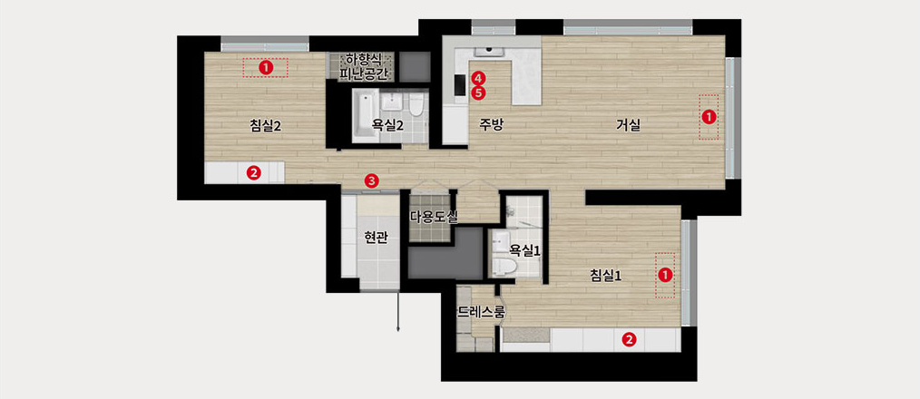 - 수납 최적화: 안방과 작은방에 마련된 붙박이장으로 옷, 침구 등을 체계적으로 정리 가능